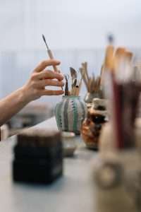 Brushes in a pottery studio are used for applying slip (liquid clay), underglaze, and glaze. They come in different shapes and sizes for various tasks.